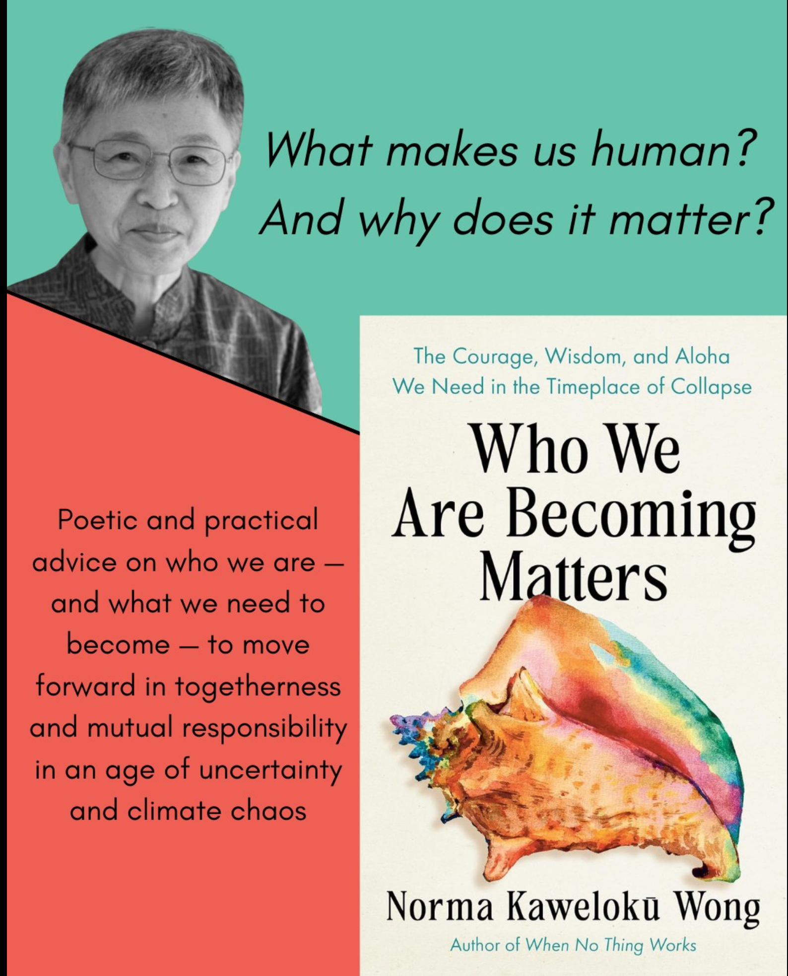Zen teacher, Indigenous Hawaiian leader, and MSC mentor Norma Kawelokū Wong’s new book, “Who We Are Becoming Matters: The Courage, Wisdom, and Aloha We Need in the Timeplace of Collapse,” is available for pre-order! This is Wong’s call to reckon with four essential capacities she calls the “Human Quotient” (courage, compassion, aloha, and strategic wisdom).